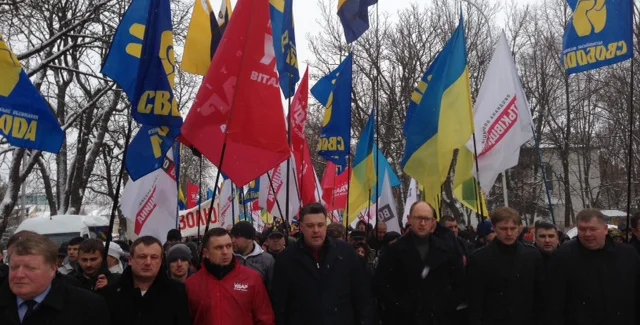 Лидеры оппозиции Арсений Яценюк и Олег Тягнибок возглавили марш в рамках всеукраинской акции "Вставай, Украина!" против президента Виктора Януковича