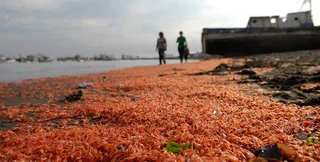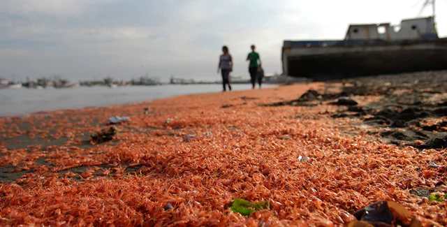 В чилийской провинции Консепсьон на пляж выбросило десятки тысяч мертвых креветок, крабов и моллюсков. В результате происшествия береговая линия окрасилась в розовый цвет