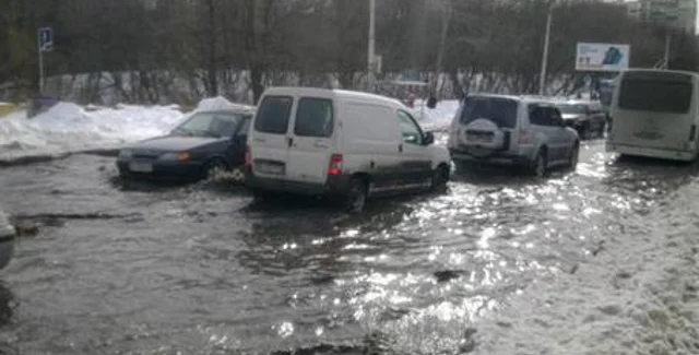 Во вторник, 26 марта, в Голосеевском районе столицы образовались огромные лужи и было затруднено движение транспорта.