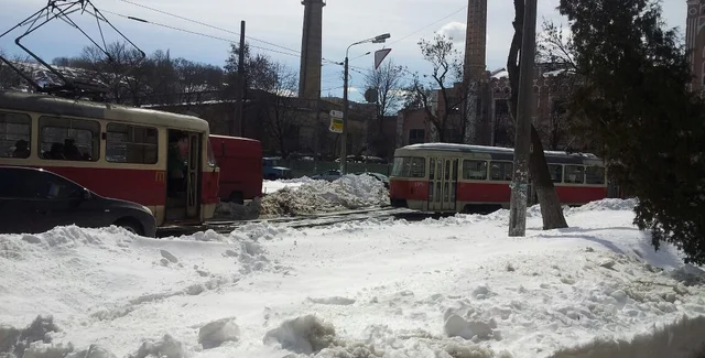 В Подольском районе Киев возникла пробка, в которую попали восемь трамваев