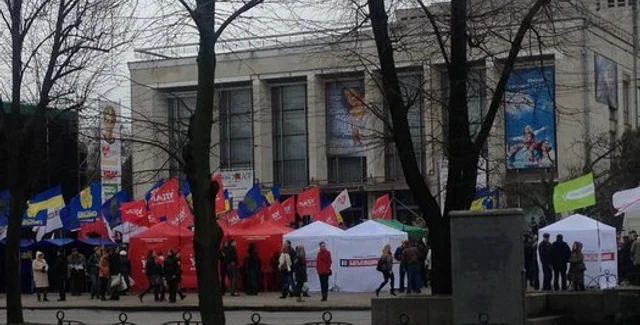 До выступлений местных лидеров оппозиции, появился большой плакат с надписью Прочь Данецкую банду.