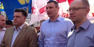 Колонну возглавляют лидеры оппозиции: председатель парламентской фракции Батьківщина Арсений Яценюк, фракции Удар Виталий Кличко и ВО Свобода Олег Тягнибок.