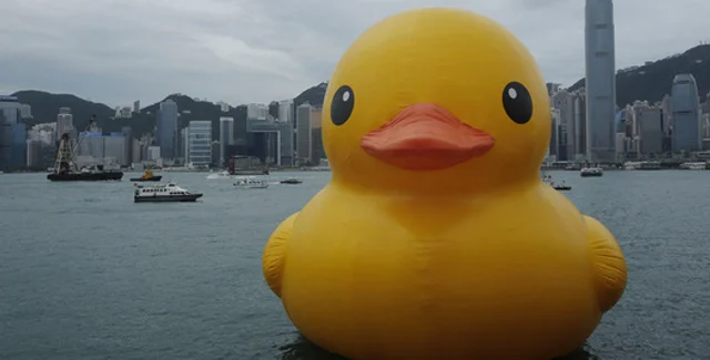 В гонконгской гавани Виктория проходит заплыв гигантской надувной утки, ранее плававшей в водах 12 городов мира.
