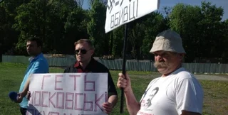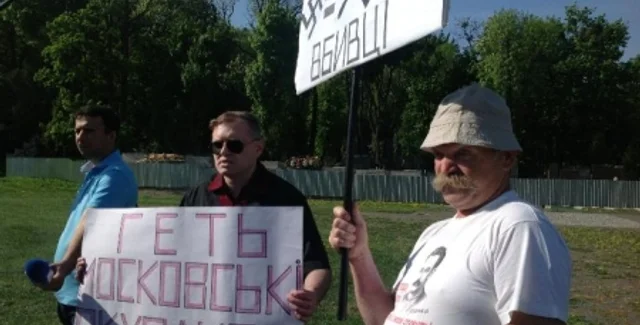 Во Львове представители Украинской республиканской партии Собор Григорий Ангел и Ярослав Климовский принесли на Марсово поле и Холм Славы плакаты с надписями Москалі, go home, Геть московські окупанти! и Геть вбивці!