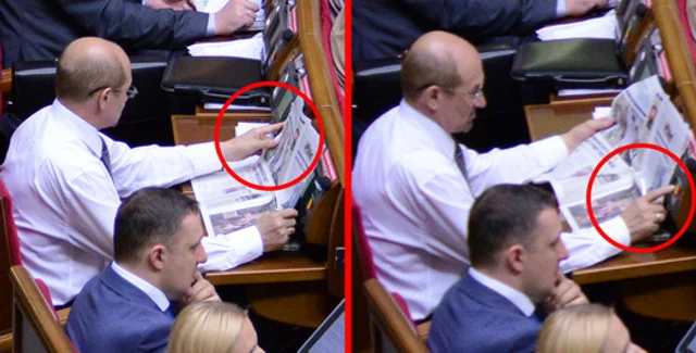 "Народный депутат-бютовец Дмитрий Шлемко оказался хитрее. Факт кнопкодавства он попытался утаить, прикрывая пульт для голосования… газетой. Несмотря на ловкость рук и с виду якобы даже отсутствие какого-либо мошенничества, на втором фото четко видно, как уважаемый нардеп, расположившись на месте народного депутата Ярослава Федорчука, сначала голосует "за того парня", а затем уже - за самого себя", - художественно описали ситуацию в ПР.