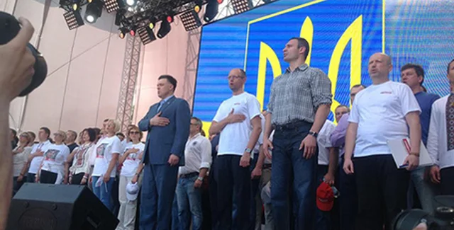 Лидеры оппозиционных фракций Арсений Яценюк, Виталий Кличко, Олег Тягнибок на митинге в субботу в Киеве подписали декларацию о координации действий на президентских выборах.