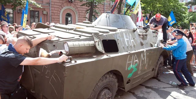 Бронемашина попыталась возглавить колонну оппозиционеров, двигающуюся с Европейской площади на Софийскую площади, однако сторонники оппозиции окружили ее, избили находившихся внутри людей и разгромили транспортное средство.