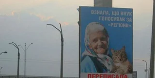 Напомним, в августе минувшего года в Днепродзержинске появился билборд с надписью: "Взнала, що внук голосував за Регіони - переписала хату на кота". Местные власти попытались привлечь автора билборда к ответственности, однако суды отказались наказывать его.