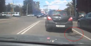 Проблемы с автомобилем начались, когда водитель начал движение после остановки на светофоре. После того, как авто проехало несколько метров, дорожное полотно начало наматываться на заднее правое колесо.