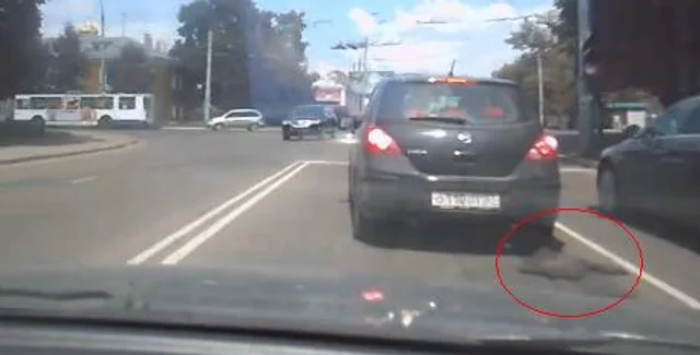 На сервисе YouTube появился видеоролик, в котором водитель автомобиля застрял посреди дороги из-за того, что дорожное покрытие приклеилось к заднему колесу