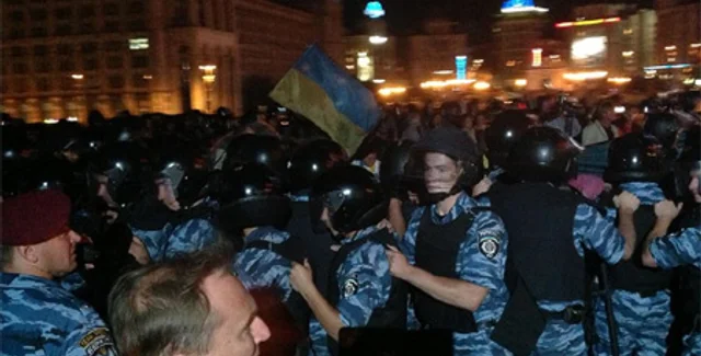 Беркут по одному выдергивает людей, и выносит за руки и ноги. Он также забрал палатки. Людей оттеснили от Глобуса в сторону метро Крещатик. В стычке пострадала камера 5 канала.