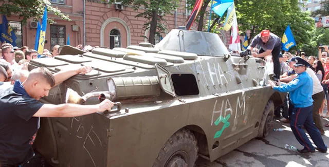 Во время общения с народными депутатами Андреем Мохником и Юрием Сиротюком милиционеры сообщили, что 19-летнего активиста Свободы обвиняют в избиении граждан, находившихся в БТР, внезапно появившейся на митинге оппозиции 18 мая.