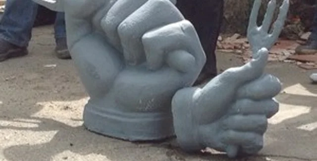 Напомним, кулак с вилкой, который символизирует дерибан, был установлен 1 августа возле нового забора на незаконной стройке в Десятинном переулке, 3-5.