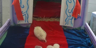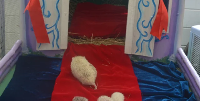 Для троих ежат, которые были названы в честь новорожденного принца, изготовили маленький дворец из дерева, к которому ведет красная дорожка. Внутри самого замка находится плюшевая кровать, украшенная бархатными занавесками.