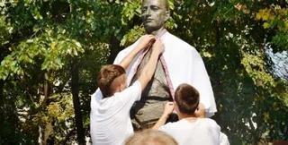 Сегодня, 24 августа, в честь Дня Независимости Украины представители партии Свободa облачили харьковские памятники Остапу Бендеру и Эллочке Людоедке в вышиванки.