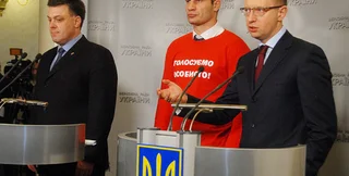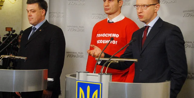 Трое оппозиционных лидеров, Арсений Яценюк, Олег Тягнибок и Виталий Кличко провели встречу с европейским комиссаром по вопросам расширения и европейской политики соседства Штефаном Фюле