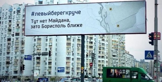 В частности, билборды, рассказывающие о преимуществах Левого берега над Правым, появились на Позняках, Харьковском массиве, Осокорках, в Дарнице, а также в других левобережных районах города.