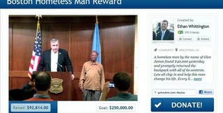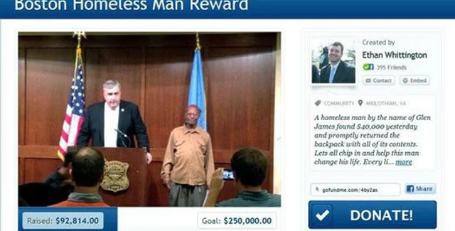 Бостонскому бездомному Глену Джеймсу, принесшему в полицейский участок рюкзак с 41 тысячей долларов, собрали уже почти 100 тысяч долларов, пишет The Daily Mail.