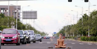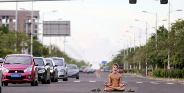 23-летний медитирующий студент из университета в Хайкоу мешал движению транспорта, более того, некоторые водители, включая группу девушек-мотоциклистов останавливались, чтобы понаблюдать за необычным явлением.