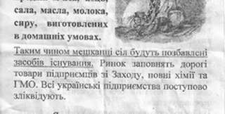 "Таким образом жители сел будут лишены средств к существованию. Рынок заполнят дорогие товары предпринимателей из Запада, полные химии и ГМО", - отмечается в распространяемых листовках.