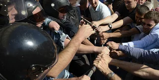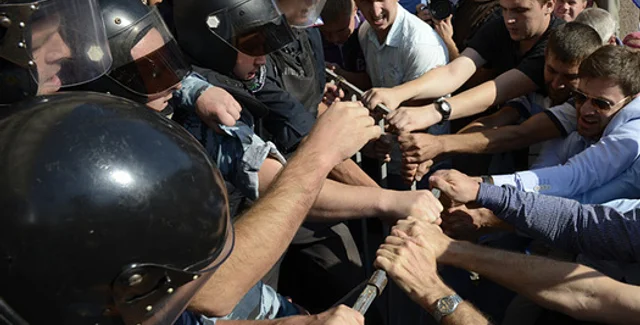 Это произошло после того, как обстановка обострилась. Собравшиеся начали перемещать часть металлического ограждения, намереваясь прорваться к мэрии. Как сообщается, митингующие попытались унести заграждение, однако милиционеры помешали им это сделать.