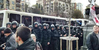 После того, как митингующие перекрыли Крещатик, бойцы Беркута оттеснили протестующих и плотной цепью выстроились вдоль проезжей части.