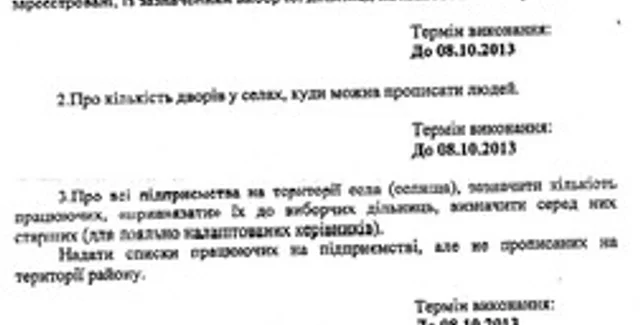 Кроме того, от глав советов требуют данные о предприятиях и количестве работников, а также просят назначить среди них главных для сотрудничества. Другие категории - данные об общежитиях и зарегистрированных избирателях. Отдельный пункт - просьба узнать о проблемах, которые беспокоят граждан, как, например, ремонт дорог или строительство объектов.