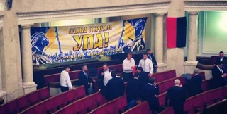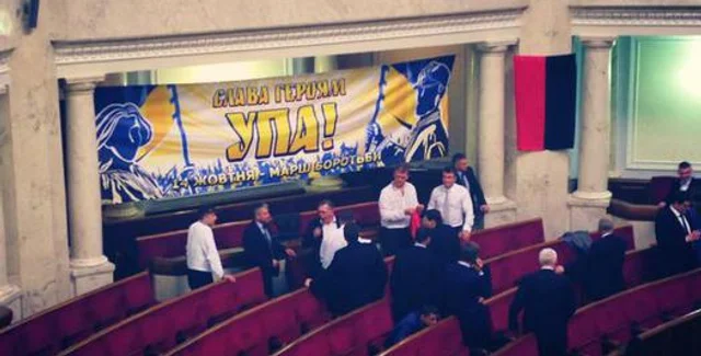 Сегодня утром, 11 октября, депутаты от фракции Свобода развернули в зале заседаний парламента плакат Слава героям УПА!
