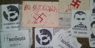 Вчера группа из двух десятков человек устроила импровизированный митинг под офисом Свободы и обрисовала стены дома свастикой и нацистскими символами, сообщил на своей странице в Facebook Александр Аронец.