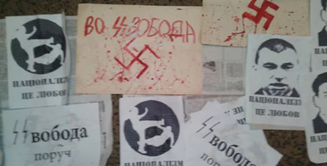 "Сегодня утром группа из 15-20 молодчиков подошли к офису Свободы и несколько минут выкрикивала, что Свобода - фашисты и другие всем надоевшие лозунги коммунистов, а также обрисовала стены дома свастикой и другими нацистскими символами", - написал Александр Аронец на своей странице в Facebook.