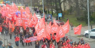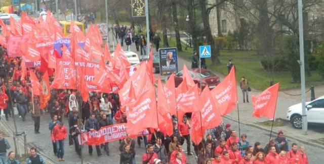 В Киеве по центральной улице Крещатик продолжается шествие сторонников Компартии, которые празднуют 96-ю годовщину Октябрьской революции. Очевидцы насчитывают до трех тысяч митингующих.