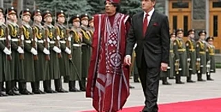 Сегодня в Киев с государственным визитом прибыл Лидер Ливийской Джамахирии Муаммар Каддафи. Президент Украины Виктор Ющенко встретил ливийского лидера на площади перед Секретариатом Президента.