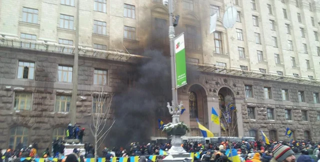 Оставшиеся два автобуса тоже отъезжают от входа в Киевсовет, больше силовиков перед входом в здание КГГА нет. Активисты говорят, что зажигательную смесь бросили не из окон, а неизвестные бросили, выбежав из толпы, две бутылки с зажигательной смесью.
