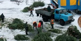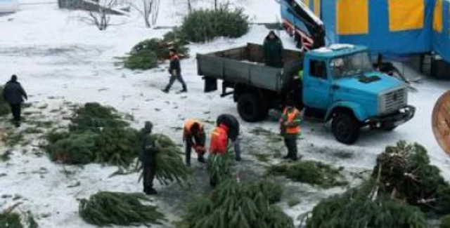 В Киеве под Аркой Дружбы народов начали устанавливать 14-метровую новогоднюю елку