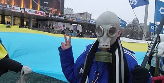 Как отмечается, флаг площадью более 200 кв.метров держат несколько десятков людей в противогазах, пишет Лига.