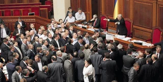 За полчаса до начала утреннего заседания Верховной Рады президиум и трибуна парламента уже заблокированы оппозицией