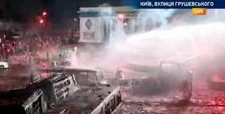 Как передает "Интерфакс-Украина", если ранее струя была направлена в сторону горящих автобусов, то сейчас она направлена в место, где находятся люди, в 15-20 метрах от автобусов. Кроме того, заработал второй брандспойт.