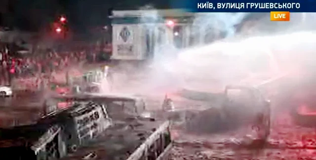Сотрудники правоохранительных органов направили потоки воды из брандспойтов в толпу протестующих возле входа на стадион им.Лобановского "Динамо" на ул.Грушевского в Киеве