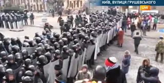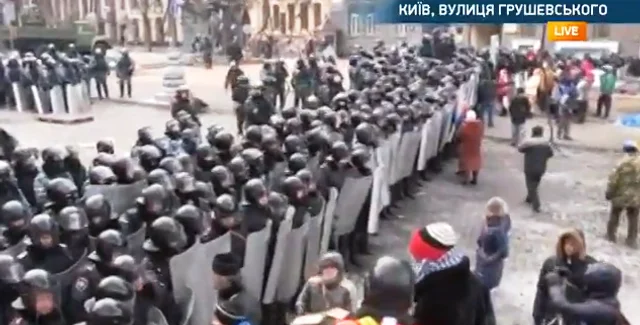 Один из протестующих прошел вдоль ряда правоохранителей с картонной коробкой, предлагая им бутерброды. Бойцы еду не взяли. Протестующих на улице Грушевского сейчас немного, около тысячи. Они стучат металлическими и деревянными палками по трубам, металлическим бочкам и сгоревшим автобусам.