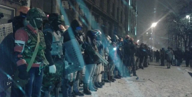 Противостояние продолжается, однако, атакующие действия не интенсивные. Активисты с периодичностью забрасывают солдат внутренних войск МВД и бойцов спецподразделения "Беркут" камнями, петардами, фейерверками и реже зажигательными смесями. Силовики метают в активистов светошумовые и газовые гранаты.