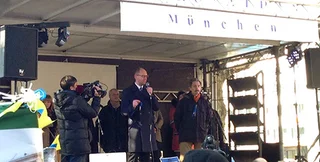 Лидер УДАРа Виталий Кличко и лидер "Батькивщины" Арсений Яценюк, которые принимают участие в Мюнхенской конференции по вопросам безопасности, выступили на Евромайдане в Мюнхене