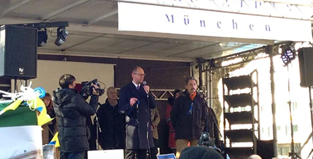 По информации пресс-службы "Батькивщины", Яценюк пообщался с участниками Евромайдана и обратился к ним со сцены. Он сообщил, что в Мюнхене он предложил так называемый план Маршалла для Украины, который предусматривает пакет политической и экономической помощи в Украине, чтобы остановить насилие, наказать виновных в преступлениях против людей, а также восстановить экономический рост государства. Яценюк поблагодарил немецким активистам за поддержку Украины.