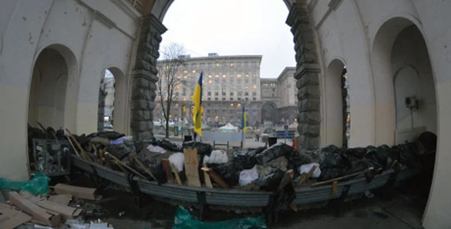 Работники ЖЭКа в четверг, 13 февраля, попытались разобрать баррикаду возле Крещатика со стороны улицы Лютеранской, однако этому помешали бойцы Самообороны Майдана
