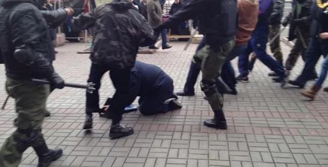 Через несколько минут сотрудников милиции окружили неизвестные в масках, касках и с палками в руках. "Сначала нападавшие сорвали с нескольких правоохранителей погоны, затем повредили форменную одежду. Далее неизвестные начали наносить работникам милиции удары палками", - излагает свое видение инцидента милиция.