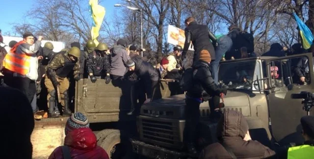 На видео видно, как митингующие и силы Самообороны Майдана вытесняют правоохранителей с грузовика, пишет УНИАН.