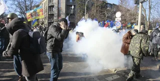 Митингующие бросают камни в сторону правоохранителей, в ответ милиционеры стреляют светошумовыми гранатами. Против митингующих был использован слезоточивый газ.