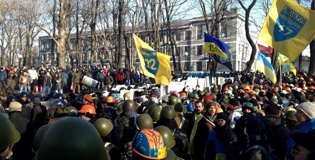 Баррикада находится на расстоянии 40 метров от кордона милиции.