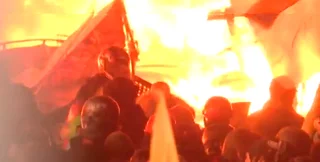 Как сообщает УРА информ со ссылкой на свидетельства журналистов, молодой человек подбежал к машине и намеревался бросить в ее кабину бутылку с зажигательной смесью, но поскользнулся, и попал под колеса водомета. Как утверждают очевидцы, водитель мог остановиться, но не стал, а переехал парню голову.