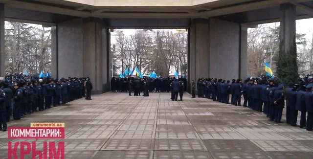 Люди продолжают прибывать к зданию парламента — сообщается, что в митинге участвует уже 10 тысяч крымских татар. Также на нескольких автобусах во главе с депутатом ВР АРК Ольгой Ковитиди прибыли десятки людей с российскими флагами.