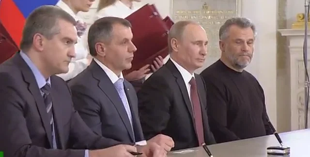 Президент России Владимир Путин, лжепредседатель парламента АРК Владимир Константинов, лже-премьер АРК Сергей Аксенов и лжепредседатель Севастополькой горадминистрации Алексей Чалый поставили свои подписи под этим договором сегодня, 18 марта, в Москве.